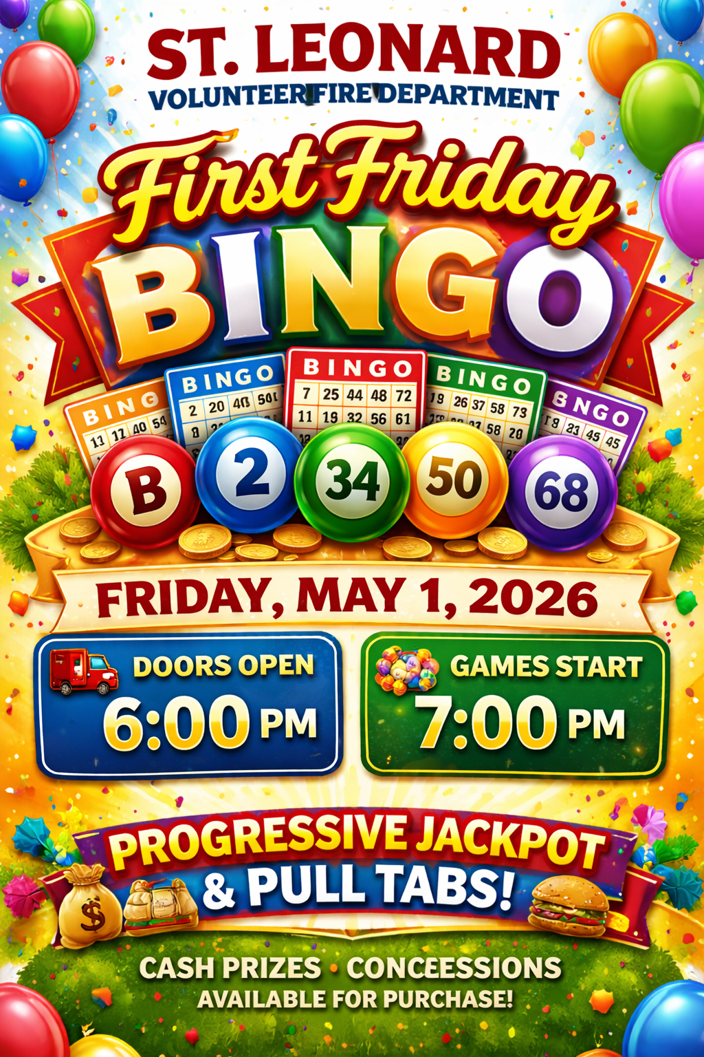 Grab your lucky dauber and join us for First Friday Bingo on May 1st — cash prizes, jackpot fun, pull tabs!